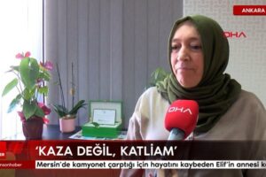 Mersin’de yaya geçidinde kamyonetin çarpması sonucu hayatını kaybeden ortaokul öğrencisi Elif Su Ekinci’nin (11) annesi Fatma Ekinci, kaza anına ait manzaraları yeni izlediğini belirterek, “İlk başta bu bir kazaydı benim için. Takdir Allah’ındır. Lakin birkaç gün evvel görüntüleri gördüğüm anda ve ayrıyeten okul görüntülerini da izlediğimde aracın ne kadar süratli geldiğini, bunun bir kazadan çok bir katliam olduğunu gördüm” dedi.