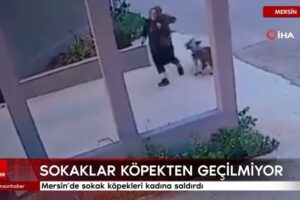 Mersin’de sokak köpeklerinin yoğunluğu dikkat çekerken, bir bayana saldırma anları da güvenlik kamerasına yansıdı. O anlarda korkup kaçan bayan kapı bariyerine çarparak yere düştü.