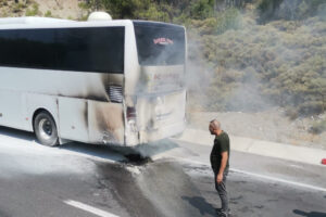 Muğla’dan Denizli istikametine seyreden yolcu otobüsünün motor kısmından dumanların yükseldiğini fark eden sürücü, durumu 112 Acil Davet Merkezi’ne bildirdi.