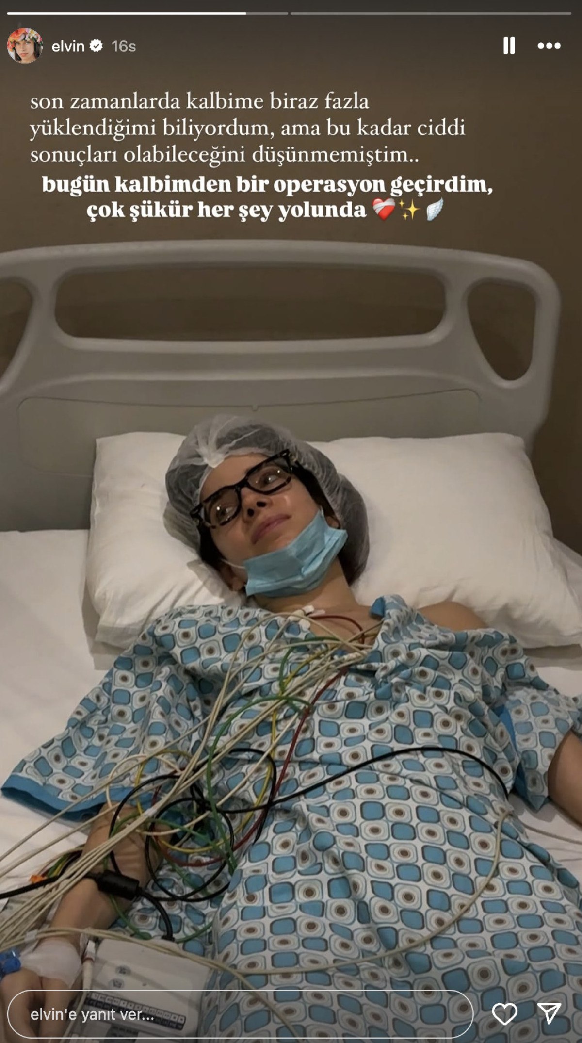 Hastaneden paylaşım yapan Elvin Levinler, “Son vakitlerde kalbime biraz fazla yüklendiğimi biliyordum fakat bu kadar önemli sonuçları olabileceğimi düşünememiştim. Bugün kalbimden bir operasyon geçirdim, çok şükür her şey yolunda” tabirlerini kullandı.