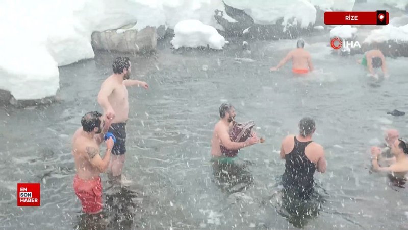 Rize’de kar yağışı altında buz gibi suya girdiler