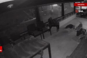 Sakarya’nın Karasu ilçesinde gece saatlerinde sahipsiz sokak köpeklerinin, bir binanın girişinde yakaladıkları kediye saldırdıkları anlar güvenlik kamerasına yansıdı.