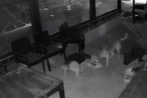 Bir mühlet yaşanan boğuşmanın akabinde iki köpeğin ağızlarında tuttukları kedi ile birlikte binanın girişinden uzaklaştığı anlar yer aldı.