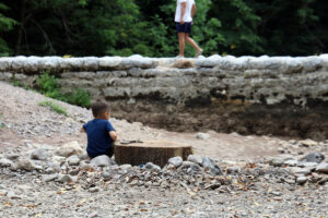 Şelalenin büsbütün kuruduğu, dere yatağında ise su yerine çıplak köklerin ve çatlamış toprakların yer aldığı görülüyor.