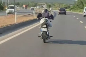 Sakarya’nın Adapazarı-Karasu D-650 karayolunda, 54 ACU 042 plakalı motosiklet şoförü E.A. (18), motosikletin üzerine yatarak kilometrelerce ilerleyerek hem kendi canını hem de trafikteki başka şoförlerin güvenliğini tehlikeye attı. Bu tehlikeli anlar, tıpkı arabada bulunan bir bayan yolcu tarafından saniye saniye kaydedildi.