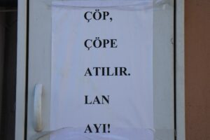 Doğaya ve etrafa hürmeti olmayan insanlara tahammülü kalmayan vatandaş,”Çöp çöpe atılır lan ayı” yazılı kağıtları sokaktaki aydınlatma direklerine ve duvarlara asarak sitem etti.