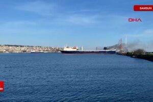 Samsun Limanı’nda bulunan kuru yük gemisinde çıkan yangının söndürülmesi için çalışma yürütülüyor.