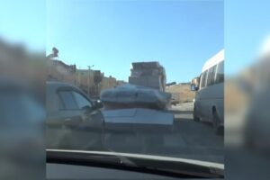 Şanlıurfa’da kent içi yük nakliyatı yapan, plakası şimdi belirlenemeyen bir kamyonetin kasasında taşınan onlarca yatak süngerini tutan ip, seyir halindeyken koptu. İpin kopmasıyla birlikte süngerler yola savrulurken, geriden gelen araçlar büyük bir kazanın eşiğinden döndü.