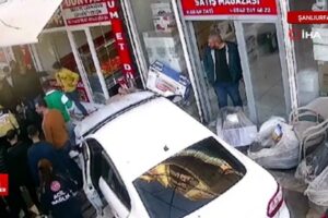 Şanlıurfa’da kaza yaptıktan sonra denetimden çıkan araba, kaldırımda yürüyen baba ve oğluna çarptı. Kaza anı güvenlik kamerasına yansıdı.