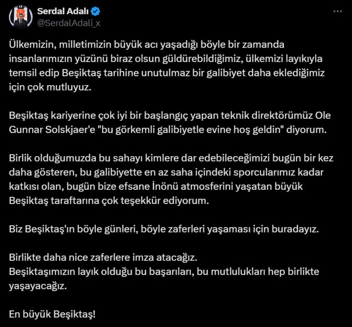 Beşiktaş Kulübü Lideri Serdal Adalı, Athletic Bilbao maçının akabinde teknik yönetici Ole Gunnar Solskjaer’e teşekkür ederken taraftarlara da bildiri verdi.