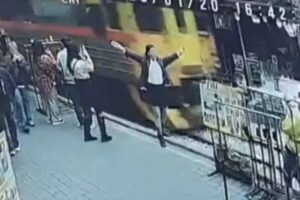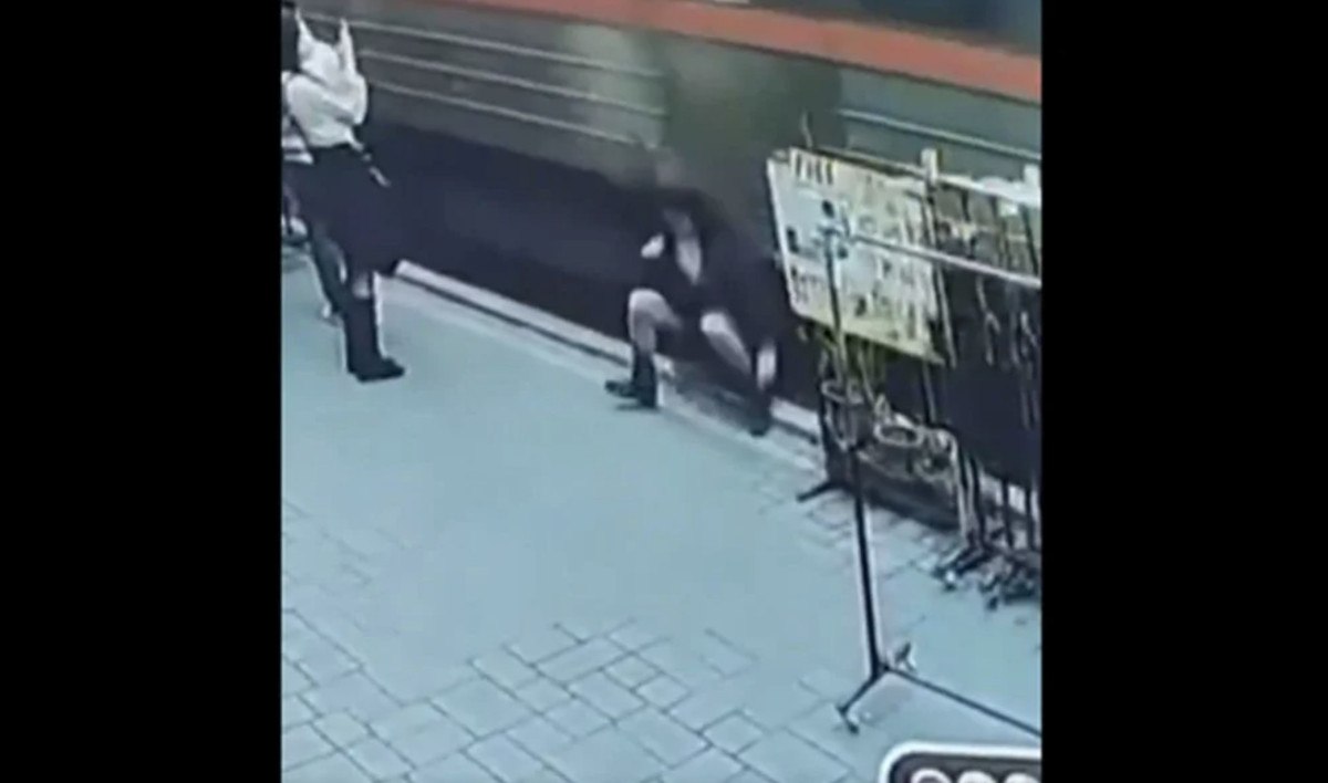 Çarpma sonucu yere düşüyor ve neredeyse trenin altına yuvarlanıyor.