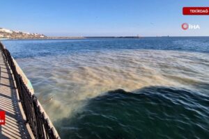 Tekirdağ’ın Süleymanpaşa ilçesinde yağmur suyu çizgisinden denize çamurlu su akarken görüntülendi. Masmavi denizin geniş bir alanda bir anda sarı tonlara bürünmesi hayrete neden oldu.