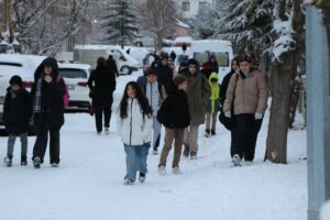 Evleri okullara yakın olan öğrenciler sabah karda yürüyerek okullarına gitti.