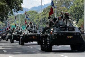 Venezuela Bolivarcı Ulusal Silahlı Kuvvetlerine (FANB) bağlı çok sayıda tank ve zırhlı araçla ordu mensupları, başşehir Caracas’ta düzenlenen konvoyla halka selam verdi.