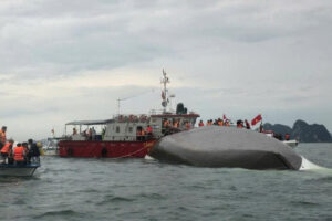 Ha Long Körfezi’nde, 48 yolcu ve 5 mürettebat taşıyan cins teknesi apansız çıkan fırtına nedeniyle alabora oldu.