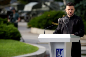 Ukrayna Devlet Başkanı Vladimir Zelensky, 23 Ağustos Ukrayna Bayrak Günü kapsamında başşehir Kiev’deki Tarihi Ulusal Müze’de gerçekleştirilen bayrak çekme merasimine katıldı.