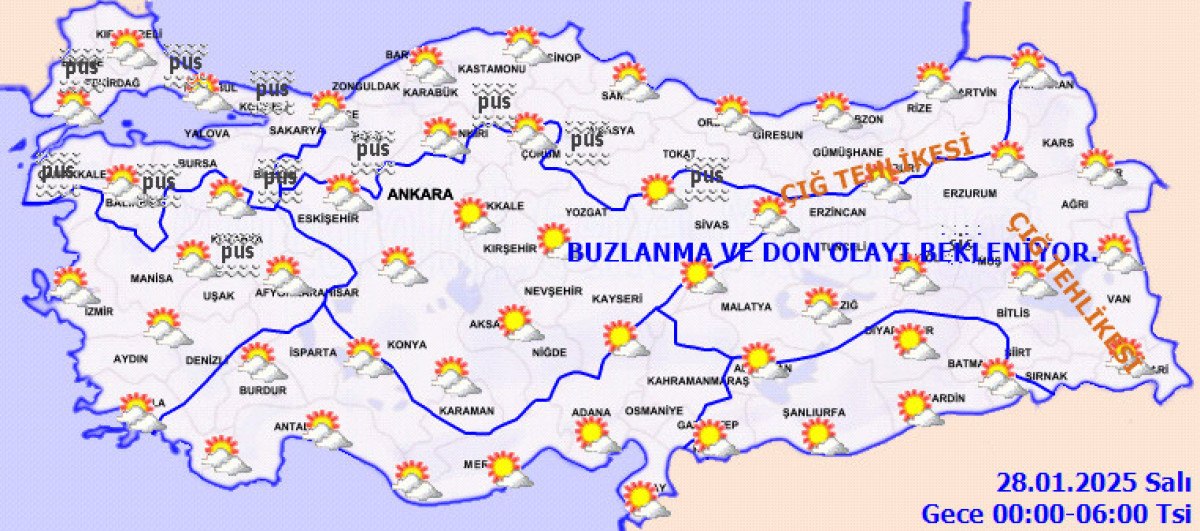 Meteoroloji Genel Müdürlüğü’nden yapılan ikazda, “Yurdun doğu kısımlarının kesimli ve yer yer çok bulutlu öteki yerlerin kesimli ve az bulutlu geçeceği varsayım ediliyor. Yurdun iç ve doğu bölümlerinde buzlanma ve don ile birlikte pus ve yer yer sis görüleceği varsayım ediliyor. Doğu Karadeniz’in iç kesitlerinin yüksekleri ile Doğu Anadolu’nun yüksek ve dik yamaçlarında çığ tehlikesi bulunmaktadır.” notu düşüldü.