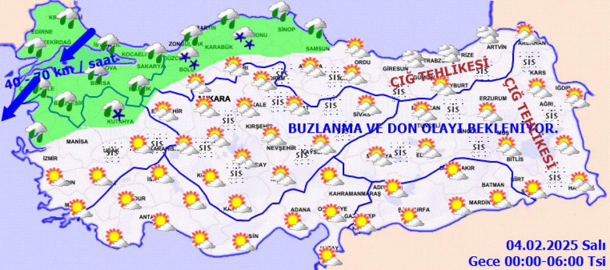 Sabah ve gece saatlerinde iç ve doğu kısımlarda buzlanma ve don ile birlikte pus ve yer yer sis bekleniyor.
