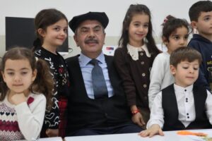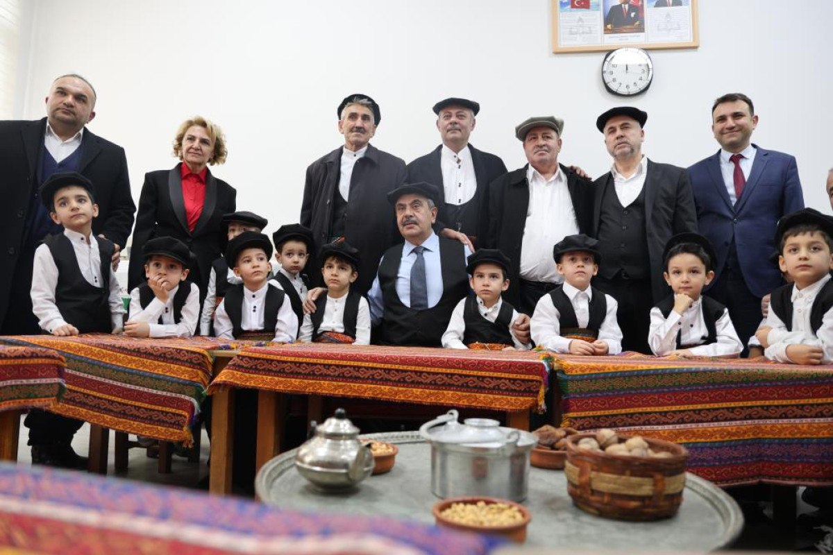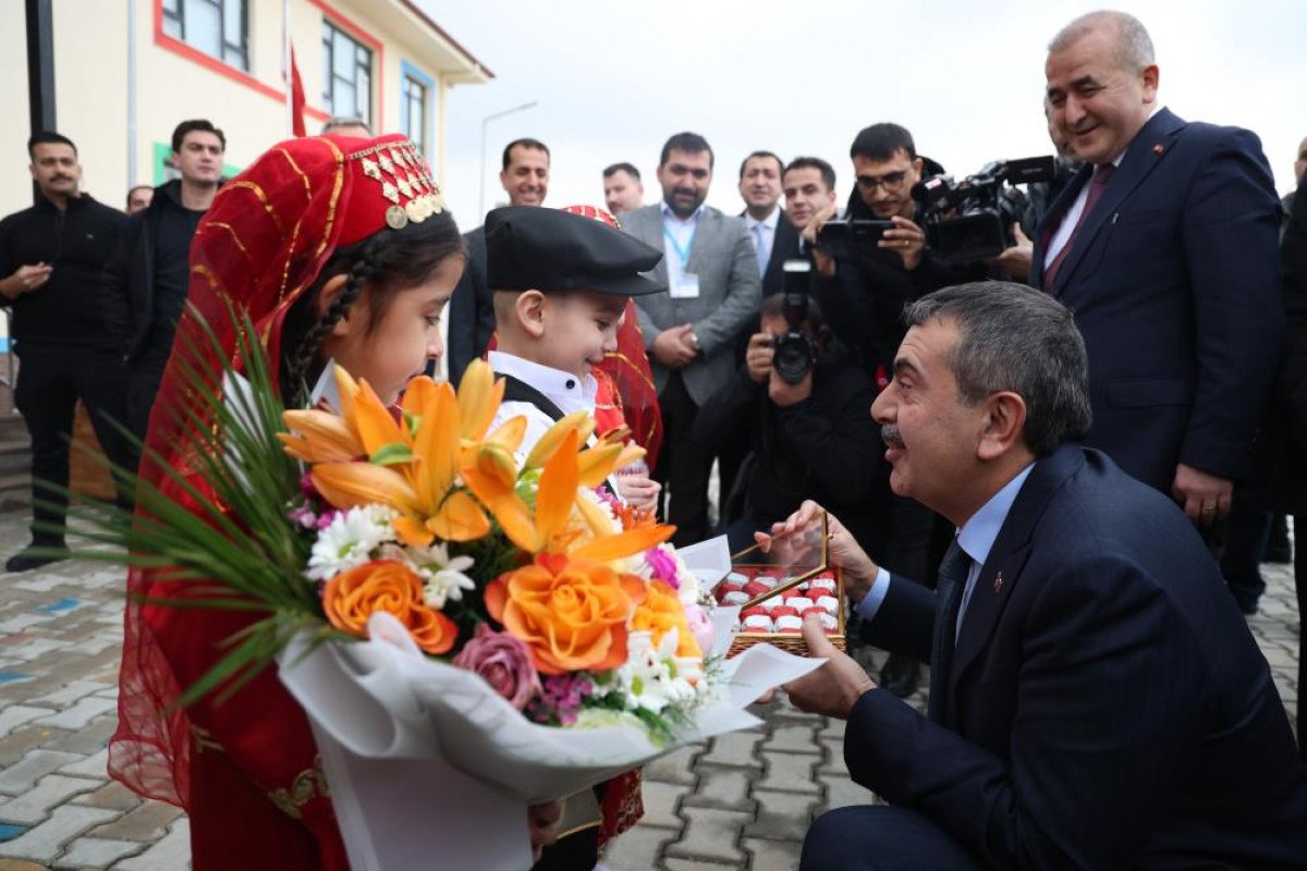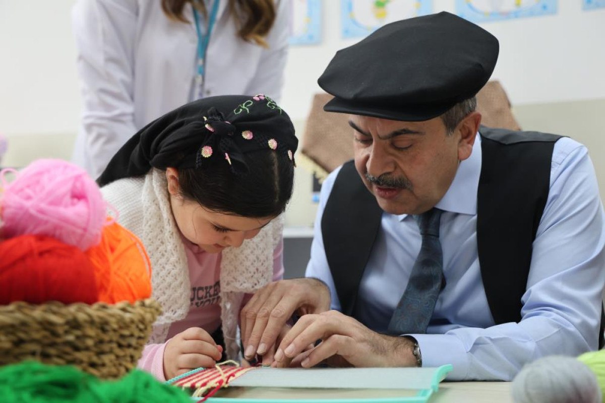 Öğrencilerin yöresel kıyafetlerine uyan Bakan Tekin, 8 köşe kasket takıp yelek giydi. Akabinde başka aktiflik atölyelerini gezen Bakan Tekin, minik öğrencilerle uzun müddet ilgilenip muhabbet etti.